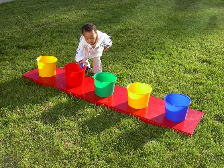 Toss ping pong balls into five buckets sequentially until you miss or win!