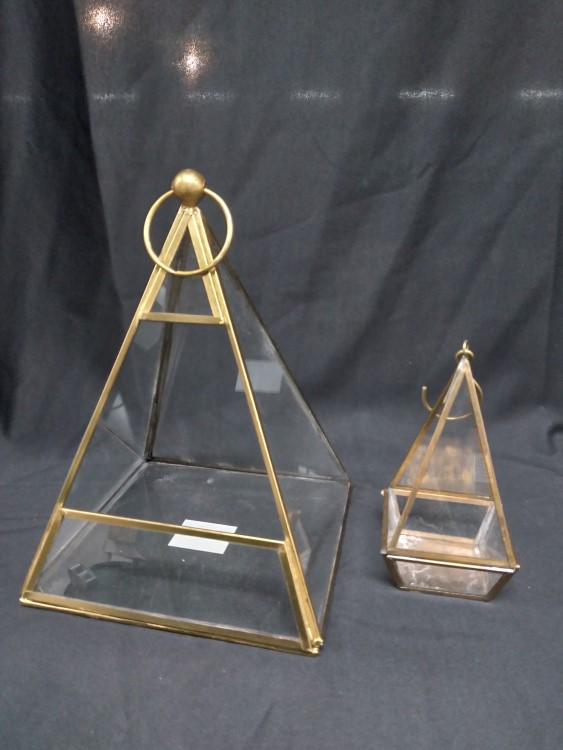 Small triangle hanging golden candle holder. Can be used for displaying candles or floral and succulents
