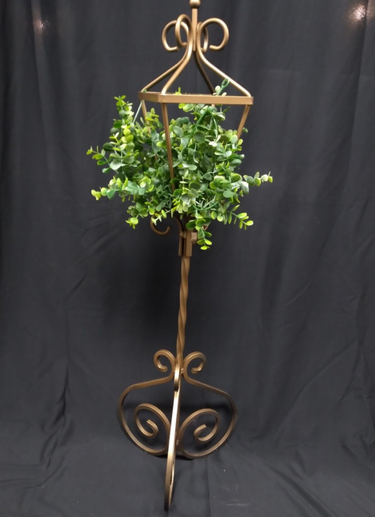 Standing brass lantern candle holder with twisted metal stem and swirls on base - 38 in tall - Fill with floral or a candle or add ribbon - pretty accent piece